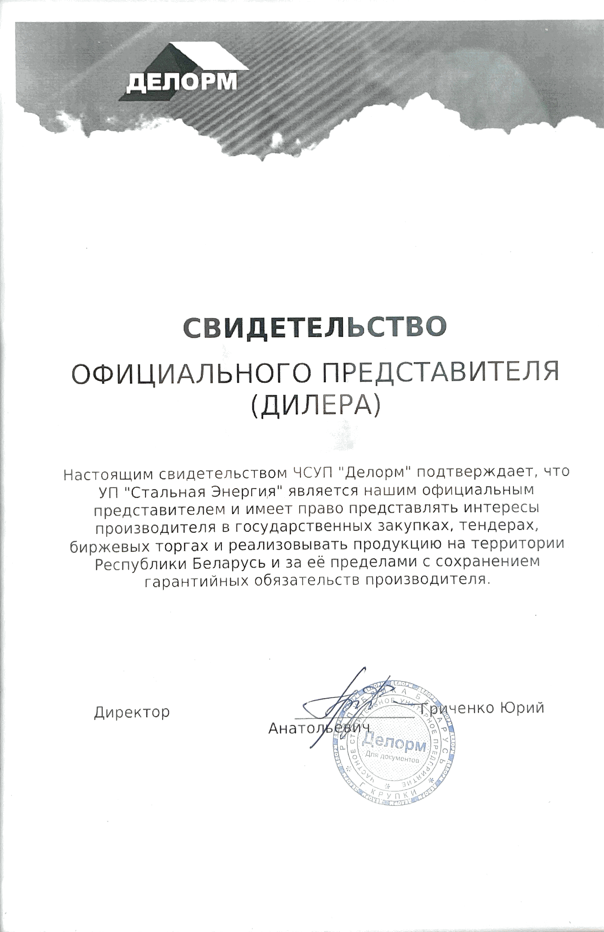 Настоящим свидетельством ЧСУП "Делорм" подтверждает, что УП "Стальная Энергия" является официальным представителем и имеет право представлять интересы производителя в государственных закупках, тендерах, биржевых торгах и реализовывать продукцию на территории Республики Беларусь и за её пределами с сохранением гарантийных обязательств производителя.