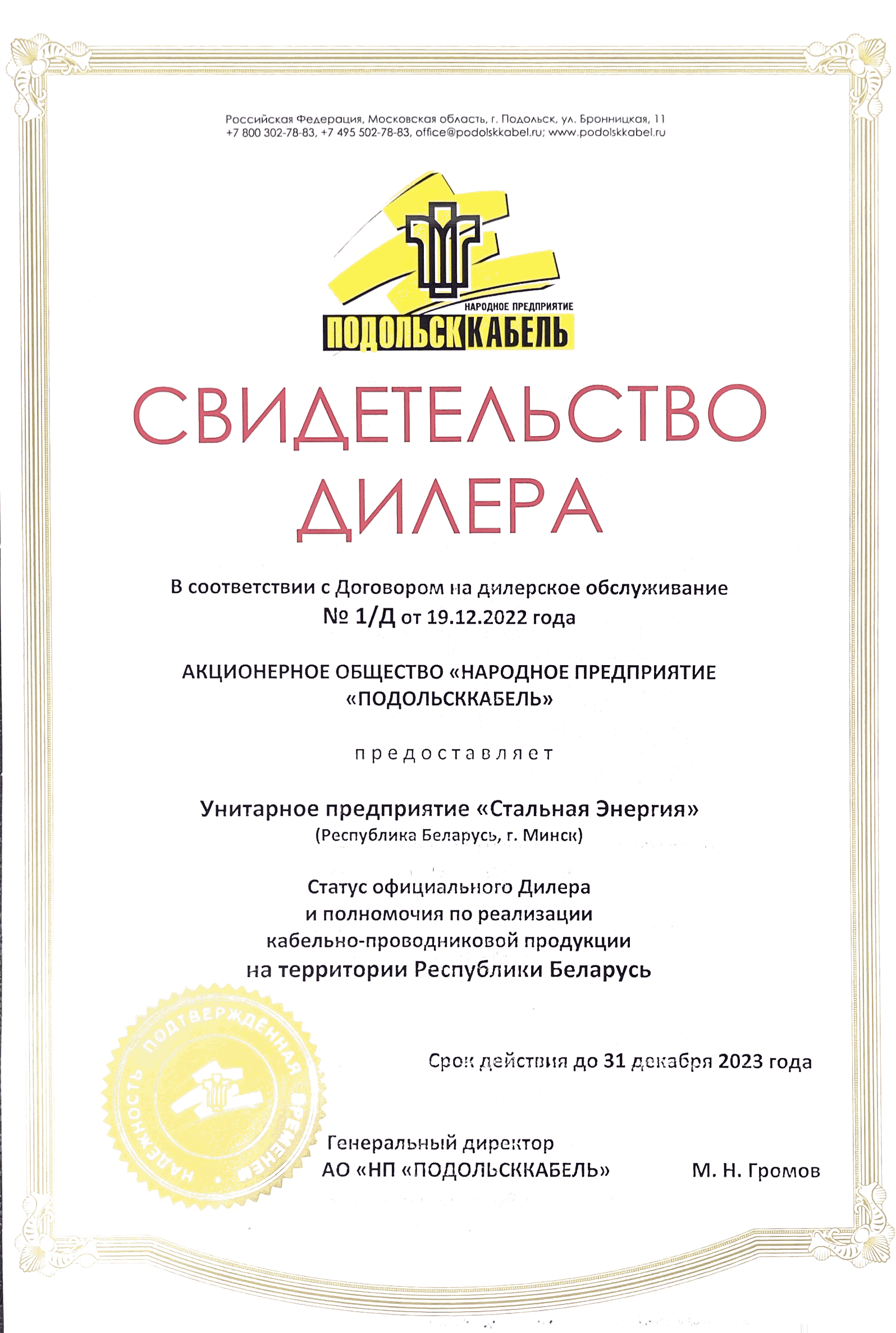 Настоящим Общество с ограниченной ответственностью "Современные кабельные технологии" (ООО "СКТ Групп") подтверждает, что УП "Стальная Энергия" является официальным представителем и имеет право представлять и реализовывать продукцию на территории Республики Беларусь с сохранением гарантийных обязательств производителя.